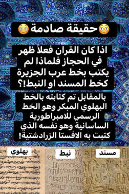 بالقرآن والأحاديث كلمات مكتوبة بالسريانية بالمعنى والخط فمثلاً كلمة ( صلوة ) تعني في السريانية ( صلاواتا ) أي صلوات أما بالعربية فيجب أن تكتب ( صلوات ) . أما البسملة ( بسم الله الرحمن الرحيم ) فكلمة بسم فهي سريانية تكتب ( بشمَ ) والشين في العربية تصبح سين . أما كتابتها في العربية فيجب أن تكتب بأسم وليس بسم . وهذا دليل واضح أنها منقولة من السريانية . . أما كلمة القرآن فسريانية أيضاً وتستعمل لحد اليوم في الكنائس وتقرأ ( قريانَ ) أي بفتح النون ، والحرف ( آ ) دخل مع النقاط والحركات التي أستحدثت بأمر الخليفة عثمان بن عفان الذي أسماه محمد ب ( حبر الأمة ) أمر عثمان زيد بن ثابت الذي كتب القرآن القديم ( النسخة الأصلية ) بكتابة القرآن من جديد وعين معه ثلاث أشخاص من قريش لكي يساعدون زيد في الكتابة أ أما النسخ القديمة فأمر بحرقها . فلم يبقى شىْ من النسخ الأصلية التي كانت تعود الى القرن السابع اميلادي فأقدم نسخة الآن تعود الى القرن الثامن . كما ذكرت مجلة الحكمة الصادرة في القدس بأن هناك نسخة قرآنية مدونة باللغة السريانية . هناك كلمات أعجمية كثيرة في القرآن وهذا ما يعتبره القراء طعناً بنصوص القرآن التي ذكرت بأكثر من موضع بأن القرآن نزل بلسان عربي مبين ( طالع الشعراء 195) وكذلك سورة يونس 26 ( لقد أنزلناه قرآناً عربياً لعلهم يعقلون ) ويعتقد بأن هذه الآية أضيفت بعد جمع القرآن من قبل عثمان لأجل الغاء دور اللغة السريانية وأثرها في لغة العرب وعلى الأسلام ولكي يثبتوا بأن اللغة العربية كاملة . وكيف يكون القرآن كله عربياً والعربية لم تكن متكاملة في زمن صدور الأسلام ؟ القرآن يحتوي على كلمات من لغات كثيرة ومنها : السريانية ، الفارسية ، العبرية ، اليونانية ، الحبشية ، القبطية وغيرها . كما نذكر بعض الكلمات السريانية في القرآن : 1- قرأن 2- سورة ( وتعني الفصل ) 3- طور ( تعني جبل ) 4- فرقان ( بُرقانة ) 5- الله ( آلها أو الوهو ) ************ الخط العربي هو مستنبط من الخط السرياني والنبطي وأصل الأثنان هو أرامي ***************** الخط الذى كتب به القرآن