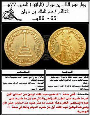 وضرب عبد الملك عملتين الأولى عندما تسلم الحكم ضرب عملة ونقش عليها صورة لرجل وبيده سيف العدالة الناري للمسيح وكتب إلى جانب الصورة بالآرامية : هلفت الله وهي تعني: خليفة الله،، كما أن العملة التي ضربها عبد الملك ثبت عليها عبارة توحيدية هامة مأخوذة من الناموس اليهودي: "اسمع يا إسرائيل الرب الهنا رب واحد" وبالعبرانية يهوه آخاد Yahweh Elohenu Echad Shema Yisrael وترجمتها كانت: قل هو الله أحد،، وفي الوجه الآخر: لا إله إلا الله وكتب حول الطوق : محمد رسول الله أرسله بالهدى ودين الحق