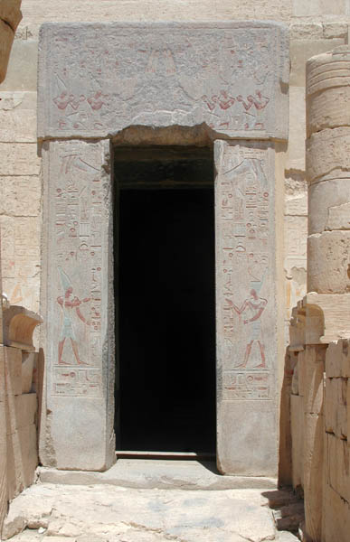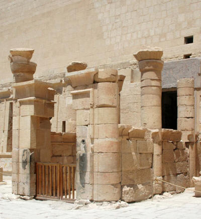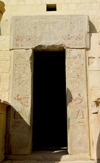 مقصورة آمون فى معبد الدير البحرى محاطة على جانبى المدخل بصورة حتشبسوت ترحب بالزائرين الطريق المؤدي لها محاط بالأعمدة: