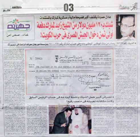 كانت جريدة الفجر قد نشرت موضوعاً تحت عنوان " أكبر فضيحة مالية وعسكرية لمبارك بالمستندات" مع صورة ضوئية لشيك بمبلغ 120 مليون دولار، صادر لأمر رئيس جمهورية مصر العربية بتاريخ 25 أغسطس 1990، مطالبة البنك المركزى ووزارة المالية ومكتب النائب العام بالرد على مصير الشيك، وإن كان دخل حسابات الدولة من عدمه.