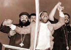 **************************************** المهزلة العبيطة / التمثيلية التى دبرها أمن الدولة فى مصر نهايتها عاش الهلال مع الصليبأمن الدولة يعتدى على الشباب القبطى يوم 18/4/2006 م وأمام كنيسة مكسيموس ودوماديوس الذين وقفوا أنمام الكنيسة لحمايتها من أعتداء الم ومجموعة من أمن الدولة كانت فى شارع جانبى يقدر عددهم بحوالى 700 شخص - ألف يصيحون عاش الهلال مع الصليب وفى الصورة الجانبية أحد رجال أمن الدولة مع القساوسة الذين اضطروا إلى أن يقفوا معه وإلا فإنه مهدد بالموت . يتعمد أمن الدولة القبض على الأقباط الأبرياء فى كل حادثة يعتدى المسلمين فيها على أقباط وقد جمع أمن الدولة الأقباط الذين يقفون أمام كنيسة القديس مكسيموس ودوماديوس وقام إعتقال عدد من المسيحيين اسماء المعتقلين في احداث الاسكندريه الذين اعتقلوا امس الاحد و جدد حبسهم خمس عشر يوم علي ذمه التحقيق و قد اتهموا احدي عشر تهمة هى ازدراء اديان مقاومة سلطات نحريض على الفتنه احراز سلاح اتلاف ضرب و جرح تعطيل مواصلات بلطجه راسة جماعات تجمهر _ وصل من مراسل الاقباط متحدون انة تم اعتقال 50 قبطيا كثير من الأطفال أقل من 14 سنة ورقم المحضر 17721 منتزة كل من: مايكل سمير موندى برزى رياض رامى رزق غطاس عماد وثيق زكى 1. هانى اسكندر جرجس اسكندر 2. مينا مملوك فخرى عبد الملاك 3. كرم عبده عطية عبده 4. ما يكل كمال عبد الملاك واصف 5. ايهاب كمال عبد الملاك واصف 6. جرجس فخرى حنا رزق الله 7. ما يكل نعيم جرجس ملاك 8. رامى رزق غطاس 9. مينا سامى بخيت عزيز 10. أسامة جندى سليمان ابوحوف 11. ماجد ذكى عزيز إبرام 12. رامز خميس بخيت جاد الرب 13. يوسف توفيق فهيم 14. وائل عبد الله جابر بخيت 15. فتحى بلورزى رياض رياض النجار 16. نصيف مجدى نصيف شنودة 17. مينا ممدوح صموئيل بطرس 18. كيرلس مجدى منصور جيد 19. نادر حسنى سعد رزق الله 20. شنودة حليم صبحى جرجس 21. مينا ناجى جيد شرقاوى 22. اميل صالح سليمان جبرائيل 23. جرجس يوسف ضيف ميخائيل 24. عاطف مسعود داود شحاتة 25. بشوى ناجح قلينى 26. فايز فريد عدلى بباوى 27. مينا ناجح قلينى 28. جرجس سعيد نجيب سعيد 29. ما يكل منير صادق 30. إسحاق يعقوب حبيب 31. ريمون حسنى سعد رزق الله 32. البير وجدى مجلع 33. مينا عزيز صديق خليل 34. صبحى بخيت عطية 35. متياس حنا عزيز 36. مينا وفيق بشارة شنودة 37. جورج أمير عزيز 38. جون فايز فرج 39. مرقص صبحى محارب 40. فريد عوض عطية منصور 41. جرجس إبراهيم جرجس 42. مينا شاكر فانوس سليمان 43. مينا عوض رزق 44. محجوب فضل الله زخارى 45. إبراهيم فايز بخيت دميان 46. مينا صادق سيدهم 47. يوسف نعيم ذكى صموئيل 48. ما يكل سمير جبرائيل