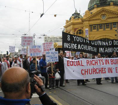 وقد بدأت المظاهره بقداس فى كاتدرائيه القديس بولس بملبورن بقياده الانبا سوريال والانبا دانيال وجميع كهنه استراليا ومجموعه كبيره من الرهبان وشعب يتجاوز 3000 قبطى ثم بعد الانتهاء من القداس خرجت المظاهره الى الشارع وفى المقدمه كان الشمامسه يرتلون وورائهم الشعب واخترقت المظاهره شوارع ملبورن حت مبنى القنصليه المصريه حاملين اليفط الكبيره حتى وصلوا الى مبنى القنصليه المصريه وهناك تقدم الاباء الاساقفه الى القنصليه بعريضه مطالب ثم توجه الركب الى مبنى البرلمان الاسترالى وهناك القى الانبا سوريال كلمه ندد فيها بكل اشكال الارهاب على الاقباط من خطف للبنات الى اقتحام الكنائس ثم القى الانبا دانيال ايضا كلمه ************************** أيـــــرلندا ***- حصلت منظمة اقباط الولايات المتحدة على بيان الأنبا أنتوني أسقف ايرلندا واسكتلندا وشمال شرق انجلترا وتوابعها Coptic Orthodox Patriarchate Diocese of Ireland, Scotland, N.E. England, And Affiliated Regions. HIS GRACE BISHOP ANTONY 40 Kingston Drive, Whitley Bay NE26 1JJ, England - U.K Tel. 0191 2972155 Fax 0191 2535558 بيان الأنبا أنتونى أسقف ايرلندا واسكتلندا وشمال شرق انجلترا وتوابعها ومجمع كهنة الإيبارشية ولجان الكنائس والأقباط المقيمين بها يستنكرون الاعتداءات التى طالت كنائس الاسكندرية بالأمس 14 أبريل 2006م والتى هى حلقة ضمن مسلسل ارهاب واضطهاد الأقباط بمصر والذى جعل منهم مواطنين من الدرجة الثانية. وهم يطالبون بتعقب الجناة الذين اعتدوا على الكنائس الاربعة وبحتمية تقديمهم إلى القضاء، ويطالبون ايضاً الحكومة المصرية بالكف عن التواطؤ مع القتلة مثلما يحدث فى كل اعتداء على الكنائس وممتلكات الأقباط... إذ أن الحكومات المحترمة هى التى تحول دون حدوث الفوضى والحرائق ونهب ممتلكات شعوبها. ونوجه النداء إلى الحكومة المصرية بضرورة الكف عن التمييز العنصرى الواقع على الأقباط فى كل مجالات الحياة وبالكف عن التحريض الاعلامى ضد الديانة المسيحية والذى نتج عنه العديد من المذابح والتى كان اخرها الشهداء والجرحى بكنائس الاسكندرية على أيدى الأصوليين الإسلاميين إن هذه الأحداث الأخيرة تعيد إلى الذاكرة ما قد حدث قبلاً من اعتداءات مماثلة فى أحداث السويس والزاوية الحمراء والخانكة وأبو قرقاص وكفر دميان والعديسات والعياط والكشح والدير المحرق ومحرم بك وغيرهم, وفى جميعها لم يتم معاقبة الجناة على ما اقترفوه من قتل وتعذيب ونهب وحرق بيوت وكنائس الأقباط وأغمض القضاء عينيه عن هذه الجرائم النكراء. إننا نتساءل مع شعوبنا "هل يُعقل أن يكون مرتكبو هذه المذابح دوماً مختلين عقلياً؟ وكيف يمكن أن نصدق أن السبب والدافع وراء كل اعتداء هو واحد لا يتغير بينما الإضطهاد الواقع على الأقباط واضح وملموس ولا يحتاج إلى أية إثباتات؟ ولو كانت هذه الاعتداءات قد اقترفها قبطى (حتى وإن كان حقيقة مختل عقلياً) ضد أحد المساجد هل كان رد فعل الحكومة والاسلاميين سيكون مثيلاً لما هو عليه الآن؟" إلى متى ينتظر الأقباط حلاً لمشاكلهم؟ إن الحكومة المصرية ترفض أى حل خارجى بينما لا يوجد أى حل داخلى ولا حتى يلوح فى الأفق، والواقع القبطى ينتقل من سئ إلى أسوإٍ بخطى سريعةً! فعلى مدى الربع قرن الماضى تحت النظام الحالى نسمع كلمات تهدئة ووعوداً ووصفاً لواقع غير موجود بينما لا يتحقق من ذلك شئ! إنه حسن للحكومة المصرية أن تهتم بحل المشاكل الدولية مثل مشكلة فلسطين والعراق ودارفور بالسودان ولكن أليس بالأحرى أن تهتم ايضاً بحل مشاكل الأقباط الذين هم أبناء الوطن الذين عاشوا فيه منذ ما قبل زمان الأهرامات؟ إننا نناشد جميع منظمات حقوق الإنسان داخل وخارج مصر بأن تنظر إلى وضع الأقباط فى مصر بعين مُدققة لترى حقيقة ما يجرى على أرض الواقع، وأن تسأل بدورها الحكومة المصرية أن تقوم بدور إيجابى فى إحداث تغيير حقيقى وجاد فى واقع الأقباط فى مصر. وفيما نحن نجتاز هذه الأيام المقدسة من أسبوع الألام نصلى من أجل سلامة مصر ومن أجل سلامة كنيستنا طالبين من الله أن ينيح نفوس الذين ذُبحوا بالأمس وعبر الأجيال وأن ينعم بالشفاء ع