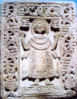 *************************************************************************************** ذكر الباحث الأثري جرجس داود جريدة وطنى بتاريخ 4/6/2006م السنة 48 العدد شاهد من الجحر الجيري بالمتحف القبطي من القرن الرابع /الخامس الميلادي,قمته علي شكل نصف دائرة نقش داخلها قرص الشمس بين الأفعيين يلي ذلك في الفراغ السفلي.منظر ديني رائع النقش يمثل أحد القديسين أو الشهداء وهو يمتطي جوادا وقد ظهر علي مقربة من هامته ملاك طائر يحمل إكليلا ويهم بوضعه علي رأس القديس التي يظهر حولها هالة من النور.الشاهد أعد للنقش في العصر الفرعوني ثم أعيد استعماله في العصر القبطي. رقم الأثر بالمتحف القبطي133
