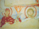 ******************************************************************************************** ذكر الباحث الأثري جرجس داود جريدة وطنى بتاريخ 20/8/2006م السنة 48 العدد 2330 رسم جداري من كنيسة السيدة العذراء السريان بوادي النطرون العامر من القرن العاشر الميلادي. يمثل السيد المسيح والسيدة العذراء وحول رأس كل منهما الهالة النورانية الخاصة به محددة بدوائر حمراء علي أرضية زرقاء,وتتميز هالة السيد المسيح بوجود الصليب ذي الثلاثة أضلاع.وعينا السيدة العذراء واسعتان,ترمزان إلي عمق حكمتها,وترتدي العذراء رداء بأكمام حمراء اللون,وتلبس علي رأسها بونيه تحتها عصابة الرأس,السيد المسيح يمسك بيد السيدة العذراء اليسري ويرفعها كرمز لكرامة العذراء وجلوسها عن يمينه.هذا المنظر يعبر عن إصعاد جسد السيدة العذراء إلي السماء واستقبال السيد المسيح لجسدها وروحها الطاهرة