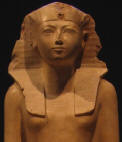 تمثال من الحجر الجيري لحتشپسوت في متحف المتروبوليتان. لوحظ أن التمثال نحت بدون الذقن المستعارة التقليدية كما واضح فيه أنعكاس الأنوثة ، إلا أنه يحتفظ بباقي رموز السلطة الفرعونية مثل : الحية الملكية ( وقد أزيل هذا النحت من على هذا التمثال ) — و الخات رداء الرأس.