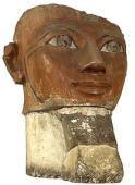 الصورة العليا على يسار الصفحة : رأس لجزء من تمثال كان يصور الملكة في هيئة الرب أوزوريس، وهو يعد قطعة فريدة من نحت الأسرة الثامنة عشرة.