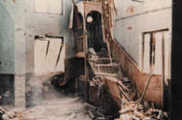 قبة الداخلية المزخرفة والمحراب والجدران الجنوبية وتحطم 48 شباكا من شبابيك المسجد المصنوعة من الجبص والزجاج الملون، واحترق السجاد وكثير من الزخارف والآيات القرآنية.