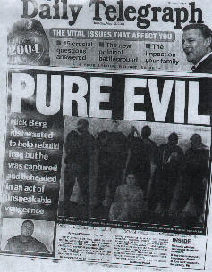 ذبح البشر ونحرهم وتقديمهم إلى الله إلاه الإسلام الوثنى كانت مجموعة مُلثمة مكونه من خمسة من المسلمين قاموا بقطع راس مهندس امريكى يعمل فى بناء وليس لى أى تعليق لأن الله الإله العربى المسلم يتكلم ويعلن عن وثنيته من أعمال أتباعه ومؤمنية المسلمين وترو وأذاعوا شريط فيديوا عن طريق الإنترنت وبكى مسيحيين أعرفهم وقام الآخرون بالصلاة لأجل هذه النفس البريئة ونشرت جريدة التلجراف الإسترالية الخبر فى صفحتها الأولى تحت عنوان بيور إفيل pure evil الخميس 13/5/ 2004م وقالت بعض وكالات الأنباء اليهودية التى أتسمت بالذكاء أن الشريط مجرد تمثلية ووقعت وكالات العربية فى الفخ الذى نصبه لهم اليهود وراح الإعلام العربى الإسلامى يؤكد بكل فخر أن الشريط صور واقع هذا الذبح وقالت إحدى الإستراليات : أنهم يحفرون قبورهم بأنفسهم وهذه بعض المواقع على شبكة الإنترنت التى يمكن أن ترى ذبح الأمريكى البرئ بأمر الله إله الإسلام بالصوت والصورة وستجد بعضها اقفل لشدة بشاعته ووحشيته وبربريته .