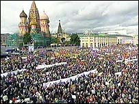واحتشدت جموع ضخمة في وسط المدينة وسارت بمحاذاة نهر موسكفا.