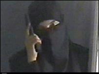 كما ظهرت في الشريط مفجرة انتحارية ترتدي السواد وحجاب وتحمل سلاحا.