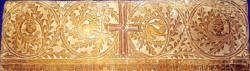 ************************************************************************************************** مقصورة ذات رسوم جصية بالمتحف القبطي من القرن السادس الميلادي,الجزء العلوي منها صورة نصفية للسيد المسيح,وعلي رأسه الهالة النورانية المميزة له,وفي الجزء السفلي السيد العذراء جالسة علي عرش بين ملاكين,وتحمل المسيح الطفل في الوسط,والجميع حول رؤوسهم الهالات النورانية,وتزدان المقصورة من الخارج برسوم نبانية. رقم الأثر بالمتحف القبطي7182 المصدر:دير الأنبا أرميا-سقارة