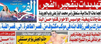 | | جريدة العربية الإلكترونية الأحد 29 أبريل 2007م، 12 ربيع الثاني 1428 هـ بعد حملتها ضد أبو هريرة والبخاري فتوى مدعومة من شيخ الأزهر لتحريم قراءة وبيع صحيفة مصرية غلاف جريدة الفجر ويحمل عنوانا بتهديدات تستهدفها دبي- فراج اسماعيل