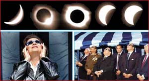 لم يكن صلاة المسلمين لكسوف الشمس وخسوف القمر فقط ولكن تحديد المحاريب يخضع لأتجاه القمر أيضاً فقد ذكر المؤرخ المسلم المقريزى أن منازل القمر تعتبر أدلة للقبلة وذلك عندما ذكر محاريب جوامع فى مصر المقريزى المواعظ والاعتبار في ذكر الخطب والآثار - الجزء الرابع - ( 143 من 167 ) فقال فى : " السبب الثالث: تساهل كثير من الناس في معرفة أدلة القبلة حتى أنك لتجد كثيرًا من الفقهاء لايعرفون منازل القمر صورة وحسابًا وقد علم من له ممارسة بالرياضيات أن بمنازل القمر يعرف وقت الفجر في المنازل وناهيك بما يترتب على معرفة ذلك من أحكام الصلاة والصيام وهذه المنازل التي للقمر من بعض ما يستدل به على القبلة والطرقات وهي من مبادئ العلم وقد جهلوه فمن أعوزه الأدنى فخري به أن يجهل ما هو أعلى منه وأدق " ماذا يعنى من ان المسلمون يصلون لكسوف الشمس وخسوف القمر ؟ لا يوجد سبب واحد منطقى لصلاة المسلمين لكسوف الشمس وخسوف القمر إلا أن هذه الصلوات مأخوذه من العبادات الوثنية لأنه كما هو معروف تاريخياً أن الوثنيين العرب كانوا يعبدون الله إله القمر الذى تزوج الشمس - فإذا كان إلههم غاضب وتغيرت هيئته إلى كسوف الشمس أو خسوف القمر فماذا يفعل الوثنى لا يوجد أمامه سوى أن يصلى إسترضاءً لإلهه الوثنى حتى يصفح عنه ويرجع عن غضبه , وما زال المسلمين حتى اليوم يخرجون فى قرى مصر بيقرعون على الصفائح المعدنية والطبول عند خسوف القمر فى الوقت الذى يتعجب فيه الأقباط لماذا يفعل المسلمون هذا حتى عرفنا اخيراً أن ما يفعلونه هو إمتداد لعبادة الله إله القمر إذا أردت التأكد من وجود هذه الصلاة إضغط على الموقع التالى http://www.al-eman.com/Islamlib/viewchp.asp?BID=253&CID=73&SW=خسوف-القمر#SR1 صلاه خسوف القمر ***************************************************************************** الدعـــــاء والتكبير عند خسوف فى منطقة السلوم فى مصر وشهدت سماء مصر في الساعة الثانية عشرة وثمان وثلاثين دقيقة من ظهر يوم الأربعاء29 مارس 2006م الحالي ظاهرة الكسوف الكلي للشمس في الثانية عشرة ظهرا وقد بدأت الظاهرة في تمام الساعة11,20 قبل الظهر بكسوف جزئي, أخذ يتدرج حتي تحول إلي كسوف كلي في تمام الساعة12,38, واستمر لمدة ثلاث دقائق و58 ثانية, ثم عادت حالة الكسوف الجزئي التي استمرت حتي الساعة الواحدة و59 دقيقة. وذكرت جريدة الأهرام 30/6/2006م السنة 130 العدد 43578 أن السيد محمد حسنى مبارك وكبار موظفين الدولة و 70 ألف سائح شاهدوا كسوف الشمس وقالت : " وعندما أظلمت السماء تعالت صيحات الحاضرين بالدعاء والتكبير, وانخرط بعضهم في البكاء عندما انتابتهم برودة سرت في أجسادهم بعد ما انخفضت درجة الحرارة بنحو14 درجة مئوية لتصل درجة حرارة الهضبة إلي18 درجة مئوية بعد ما كانت32 درجة " وأوضح علماء الفلك أن الكسوف الكلي للشمس, الذي تم رصده في مصر, سيحدث مرة أخري في أغسطس عام2027, وذلك في منطقة وادي الملوك بالأقصر *************************************** نشرت جريدة الأخبار يوم الخميس 7 سبتمبر 2006 م السنة 55 العدد 16967 خسوف جزئي للقمر - تشهده مصر مساء اليوم - تشهد مصر والمنطقة العربية وعدد من دول العالم خسوفا جزئيا للقمر في تمام الساعة 9 و5 دقائق مساء اليوم.. وينتهي الساعة 10 و37 دقيقة.. صرحت بذلك د.رباب هلال عبدالحميد رئيس قسم الفضاء بالمعهد القومي للبحوث الفلكية والجيوفيزيقية وطبيعى أن المسلمين سيخرجون فى القرى يضربون على الأوعية المعدنية وهم منزعجين لأن القمر الإله مخنوق نشرت جريدة الأخبار يوم الخميس 7 سبتمبر 2006 م السنة 55 العدد 16968 وقد وقع الخسوف في مصر الذي توافق مع شهر شعبان في الساعة التاسعة و5 دقائق. وصرح الدكتور عبدالفتاح جلال أستاذ علوم الشمس والفضاء بمعهد البحوث الفلكية ـ لمندوب الأهرام وجيه الصقار ـ بأن الخسوف الجزئي للقمر بلغ19% من قرصه, وأنه بلغ أقصي درجة له في الساعة التاسعة و51 دقيقة و21 ثانية, وانتهي تماما في العاشرة و37 دقيقة و41 ثانية, وقد أستمر خسوف القمر 46 دقيقة , الأهرام بتاريخ 7/1/2007 م السنة 131 العدد 43861 كسوفان للشمس وخسوفان للقمر تحدث خلال العام الحالي, تري مصر واحدا منها, هي الظاهرة 