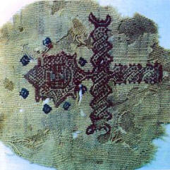 جريدة وطنى 6/12/2009م ذكر الباحث الأثري جرجس داود قطعة من الكتان بالمتحف القبطي من القرن الرابع/الخامس الميلادي علي شكل صليب ذي عروة علي شكل علامة غنخ المصرية القديمة نسج بطريقة القباطي وطرزت تفاصيله الزخرفية بفره السوماك والصليب بالصوف الكحلي,أما التفاصيل الزخرفية فمن الخطوط الكتانية البيضاء. رقم الأثر بالمتحف القبطي1758 |