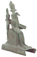 تمثال صغير يصور اثنين من المعبودات ( المتحف المصرى ) ؛ أحدهما رب برأس طائر يجلس على كرسي بدون ظهر وبدون زخرفة أو نقوش.