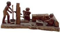 أحد هؤلاء العمال يمسك منشاراً طويلاً ليقطع ألواح من الخشب من عارضة خشبية رأسية مثبته فى عامود. ونجد آخر يقطع خشب بواسطة القدوم وهو عبارة عن نصل مقوس وحاد ومثبت عموديا على مقبض الآله. والعامل الثالث ممسكا بالة لحفر الخشب