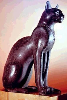 يمثل هذا التمثال الصغير باستت ( المتحف المصرى ) ، ربة المرح، نموذجا للتماثيل البرونزية التى كانت توضع فى معبد بوباسطة كقرابين نذرية.