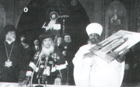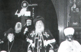 | |  جانب من الأستقبال الشعبى فى الكاتدرائية المرقسية بدير الأنبا رويس الكرازة السنة 35 العددان 25-26 27يوليو2007 م إلتف المحتفون صفوفاً يعلوا بعضها بعض بألحانهم الجميلة , وإشترك فى ذلك الأقباط وكورال الإثيوبيين , وكان الإستقبال فوق التصور ترك فى أعماق البطريرك والوفد الأثيوبى أعمق الأثر , إذ ما كانوا يتصورونه , ثم أنتقل الكل إلى داخل الكاتدرائية |  البابا يلقى كلمته باللغة الإنجليزية ونيافة الأنبا بيشوى يترجم الكرازة السنة 35 العددان 25-26 27يوليو2007 م بعد أستقبال حافل أثناء دخول الأباء البطاركة الثلاثة إلى الكاتدرائية , وبعض الألحان من الشمامسة الأقباط , ومن كورال الأثيوبيين , تكلم قداسة الكاثيلوكوس أرام بكلمة عميقة , ثم ألقى البابا كلمة وكانت كلها تفيض محبة , والتاريخ الطويل عن الكنيسة الأثيوبية منذ القديس البابا أثناسيوس الرسولى 329م |  البابا يهدى قداسة البطريرك أيقونة القديس أثناسيوس الرسولى الكرازة السنة 35 العددان 25-26 27يوليو2007 م وهى أيقونة قامت برسامتها راهبات القديسة دميانة بالبرارى , وقد تسلمها أبونا البطريرك باولص بفرح وقبلها , ورفعها بيدية أمام الجمهور , وقد كانت لفتة كريمة |