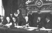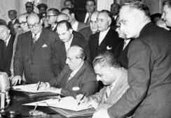 *****************************************وأخيراً تم توقيع المعاهدة السورية الفرنسية في باريس اعترفت فيها فرنسا باستقلال سوريا إلا أن هناك كان شرطاً بأن قواتها العسكرية تظل في البلاد وبهذا ظلت خاضعة للاحتلال الفرنسي. وفى الصورة المقابلة الوفد السوري : هاشم الأتاسي (الثالث من اليسار) وفارس الخوري (الثاني من اليسار).