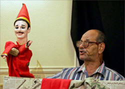 ثم بدأ الاحتراف في شارع محمد علي وشارع عماد الدين، حيث التقي أشهر لاعبي الأراجوز في مصر وقتها أمثال أحمد زوربة، نعمة الله العجمي، ومصطفى الأسمر وغيرهم ممن ساعدوه على العمل في هذه المهنة من خلال تقديمه في الحفلات المدرسية وأعياد الميلاد وحفلات الأسر الميسورة. والعرائس كانت قديما تصنع من الخشب أما الآن فهي تصنع من البلاستيك كباقي لعب الأطفال، لها ملابس مميزة ووجه مضحك وأحيانا يعبر عن الجدية المفرطة ويغير الأروجوزاتى صوته ويضع فى فمه أداه يطلق عليه البعض "زمارة" الأراجوز ويسميها أصحاب المهنة بـ"الأمانة" يقوم اللاعب بصنعها وهي عبارة عن قطعتين "استانلس" وكانت قديما تصنع من النحاس ولكنها كانت تصدأ بعد فترة وتسبب مشاكل صحية للاعب الأراجوز؛ لذا اُستبدل بالنحاس الاستانلس توضع فوق اللسان وتحديدا في منتصف الحلق فيخرج منها الصوت الذي نسمعه. وفى العادة يختبئ هذا الشخص تحت مائدة أو وراء لوح من الخشب به مستطيل مفتوح حيث تحرك عرائسة والتى تكون مشابهه للعرائس العادية أما عن القصص والمشاهد الذى يقدمها هذا الفن فالحكايات اختلفت وتطورت مع الزمن فالحكايات في الموالد كانت أغلبها ارتجالية تعتمد على التواصل مع الجمهور المتفرج سواء من خلال الأغاني أو الحكايات الشعبية التي يحفظها عن ظهر قلب، أما الآن فحكايات الأراجوز رسائل غير مباشرة موجهة للجمهور خاصة الأطفال تغرس فيهم القيم والأخلاق الحميدة. ومضة *************************************************** (2) لطفى أحمد نصار : وسائل الترفيه في عصر سلاطين المماليك، الهيئة المصرية العامة للكتاب ، القاهرة 1999 (4) هو مصطفى عثمان اأشتهر باسم صابر المصري من مواليد إمبابة عام 1939 وكان صابر قد فقد عينه الشمال نتيجة إصابته بحمى التيفود في صغره فأطلقت أمه عليه اسم صابر لصبره أما لقب "المصري" فقد اكتسبه من عمله مع الساحر فؤاد المصري في السيرك القومي في الستينيات من القرن الماضي. |