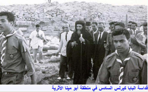 فى يوم 15 بؤونة 1675 ش الموافق 22 يونيو 1959 م فى ذكرى تأسيس كنيسة الشهيد مار مينا وهو أول عيد بعد تولى قداسة البابا كيرلس السادس كرسى البطريركية ذهب إلى منطقة ابو مينا الأثرية وهناك أقم أول صلاة للقداس الإلهى بعد أن إنقطع الصلاة فى هذا المكان لعدة قرون وقد حضر الصلاة عدد كبير من المصليين - وكان هذا أول إحتفال يحضرة البابا البطريرك فى هذه المنطقة منذ ما يقرب عن سبعة قرون من الزمان ولم يكمل أبونا رسالته كما أنه لم يرسلها وظلت حتى يذكرها التاريخ , وقام بكتابة رسالة أخرى إلى أخيه الأكبر يوحنا يطالبة بعمل محاولات لأنشاء دير مار مينا فقال : " .. أكتب لك هذا الخطاب فى ساعة متأخرة من الليل - الساعة الواحدة بعد منتصف الليل , ولم اعلم ما هو الدافع , ولعله من الذى به نوجد ونتحرك وبأرشاد الشهيد العظيم مار مينا العجائبى صاحب الشفاعة المقبولة عند سيدة , أنت تعلم ما هو أشتياقى ورغبتى من عشرين سنة تقريباً فى تعمير دير مار مينا بمريوط وكم سعيت وكم إجتهدت فى سبيل ذلك ولكن لم يكن الوقت جاء بعد ... علمت أخيراً من الأستاذ يوسف مرقس ومن ألأيتاذ عوض الله أبراهيم بأن النية متجهة فى ترميم الهيكل , والمجلس أعتمد مبلغ 500 جنية , لذلك لعل الرب يكون أراد , والآن كل ما أرجوه مقابلة د/ منير شكرى بالأسكندرية والتفاهم معه , هل جمعية مار مينا مسجلة ؟ وهل بلغهم وهل بلغهم أمر ترميم الهيكل ؟ لأن لى رغبة فى المساهمة فى هذا المشروع , بل فى نيتى أن أكتب كل شئ بأسم دير مار مينا ... ضرورى من البحث عما ذكرته من أمر دير مار مينا .. وتتفق مع د/ منير وكتب رسالة ثانية إلى شقيقة قال فيها : " أنا بخصوص مار مينا , فهو دائما يلح على فى عمارة الدير بمريوط .. فإهتم مع د/ منير شكرى , ذلك لأنك وعدت فنبدأ أولاً صومعة أو اثنين خارج الدير بجوار الإستراحة الموجودة هناك , ثم نبتدأ بترميم المذبح بواسطة مدير المتجف القبطى , لأن بيده ذلك , ومتى وضعنا أرجلنا هناك فتأكد ان الرب سيعمل معنا , ضرورى الإهتمام ومقابلة د/ منير شكرى ومن له شأن فى هذا الموضوع , ويوجد بالبطريركية بالأسكندرية خطاب من مصلحة ألآثار بالتصريح بإقامة الشعائر الدينية بدير مار مينا بمريوط - نكرر القول - ضرورى الإعتمام بذلك , إله مار مينا صاحب العجائب وتحقق حلمه ومضت عدة شهور بعد الرسائل التى أرسلها أبونا مينا غلى أخية الكبير يوحنا ومباحثاته مع د/ منير شكرى بخصوص تعمير دير مار مينا حتى تم أختيار أبونا مينا البراموسى المتوحد الناسك التقى ليكون بابا وبطريرك الكرازة المرقسية وجلس عل كرسى مار مرقس رسول الرب يسوعغلى ارض مصر فى 10 مايو 1959م . وسعى البابا كيرلس السادس لدى هيئة تعمير الصحراء فأشترى خمسين فداناً بجوار آثار دير مار مينا وتقع على حدودها الشمالية , وكان البابا يأخذ كل التبرعات التى يقدمه صورة نادرة لبطريرك المعجزات وهو أمام مبانى كاتدرائية مار مينا فى صحراء مريوط St. Mina's new Cathedral at St. Mina Monastery in Mariut accommodatesabout 3000 persons, has seven altars and its towers are 45 meters in height