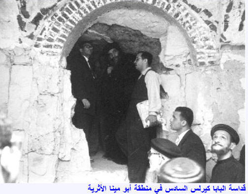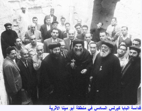 رسائل أبونا مينا ( البابا كيرلس السادس ) تحكى قصة بناء دير مار مينامحاولات بناء دير مار مينا عندما كان البابا كيرلس السادس راهبا كان يشتاق أن يسكن فى منطقة مريوط حيث آثار مار مينا العجائبى , وسعى مراراً أن يكون هناك صورة ما , لأرجاع هذا الدير إلى الحياة مرة أخرى . وفى أحدى محاولاته سعى لأستصدار قرار من مصلحة ألاثار لبناء قلاية بجوار آثار دير مار مينا القديم فطلب مساعدة الأستاذ بانوب حبشى الأثرى الذى كان يعمل وقتها مفتشاً بالمتحف اليونانى الرومانى بالأسكندرية , وقد قام الأسقف إيسوذوروس بنشر محاولات أبونا مينا البراموسى فى إعادة دير مار مينا إلى الحياة مرة أخرى فقال : وفى هذه الأيام قام أحد الرهبان وسعى بإجتهاد فى الحصول على تصريح من مصلحة الآثار ليسكن بالدير المذكور , فتحصل على خطاب من سعادة مرقس باشا سميكة مدير المتحف القبطى لمدير ألاثار , وأخيراً توجه إلى الإسكندرية وبمساعدة حضرة الفاضل الغيور بانوب حبش مفتش الآثار بالأسكندرية وقدم طلباً لمدير الآثار حدثت هذه المجهودات لبناء دير أو أعادة بناء دير مار مينا القديم أثناء الحرب العالمية التى حدثت بين الأنجليز والألمان فى العالمين وهى لا تبعد كثيراً عن مريوط لهذا لم تكلل هذه المحاولات . وفى رسائل ابونا مينا البراموسى (الأنبا كيرلس) إلى شقيقة الأكبر الأستاذ حنا عن محاولاته العديدة فى تعمير دير مار مينا بمريوط , وكلفه بالسعى لدى البابا يوساب الثانى .. ولم تكلل هذه المحاولات أيضاً بنجاح لعدم أستقرار الأوضاع فى الكنيسة فى هذه الفترة القس رافائيل : مذكراتى عن حياة البابا كيرلس السادس - الجزء الثانى . خطوة نحو تحقيق الهدف ببناء دير مار مينا وفى أحدى ليالى مارس عام 1958م أرسل أبونا مينا (الأنبا كيرلس) رسالة إلى د/ منير شكر