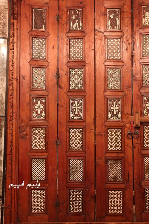 الكتابة السريانية الموجودة أعلى الباب ترجمتها الإكرام والتسبيح والتمجيد والتعظيم للثالوث القدوس المسجود له والمتساوى فى الجوهر ثم صليب فى منتصف الحلق