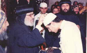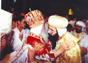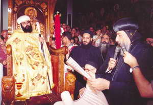 ![]() وبدأ نيافته الصلاة بصلاة الشكر ثم تسبحة رفع بخور عشية وتم تسليم نيافته التقليد الخاص بالتنصيب والموقع عليه من قداسة البابا المعظم الأنبا شنودة الثالث بعد أن وقع عليه الأباء الأساقفة .