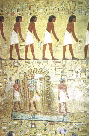 رسوم مشهد لمجموعات النجوم والأبراج Constellations من مقبرة "سيتى الأول" ويغطى هذا الجزء من القاعة قُبة، تبدو كالسماء وهى بلون أزرق قاتم معتم كالليل، وعليها أبراج الشمس المعروفة بشكل الحيوانات التى ترمز إلى تلك الأبراج. وهناك قاعة مُلحقة صُنعت حولها مقاعد من حجر. وكان الغرض منها تخزين الأثاث. وجدرانها مُغطاة بنقوش جميلة تُمثل الشمس فى رحلتها إلى العالم الآخر. وتوجد أيضاً حجرتان جانبيتان نُقشت جدرانها بنقوش دينية مازالت ألوان بعضها واضحة. أما عن يمين البهو فتوجد حجرة جانبية أخرى نُقشت على جدرانها قصة هلاك البشرية، وهى تقص كيف غضب الإله "رع" على شعبه حينما ضحكوا عليه عندما أصبح عجوزاً، وأصبحت عظامه كالفضة ولحمه كالذهب، وشعره كاللازورد (أزرق). لذلك جمع مجلساً من الآلهة ليستشيرهم فى كيفية الانتقام من هذا الشعب الغادر. فأشار عليه جده "نون" (البحر العظيم) أن يرسل عبدته "حتحور" فى صورة اللبؤة "سخمت" لتفتك بهم. |