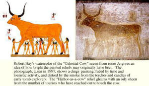 منظر للإلهة "حتحور" على شكل بقرة داخل مقبرة"سيتى الأول"؛ وعلى اليسار رسم حديث رسمه "روبرت هاى" لنفس مشهد البقرة "حتحور" ولونه بألوان مائية ساطعة فى محاولة منه لتخيل الألوان الأصلية للوحة التى بهتت مع الزمن وفعلاً أخذت هذه الإلهة تفتك بالناس حتى سالت الدماء أنهاراً، فأشفق الإله "رع" على رعاياه وأمر عبدته أن تكف عن قتلهم، وتحايل عليها حتى كفت أذاها عنهم، وبذلك نجا العالم من الهلاك. لكن الإله "رع" سئم الحكم على الأرض فارتفع إلى السماء على ظهر "نوت"، ولكنها خافت فأسرع إليها الإله "شو" رب الهواء، ورفعها فوق كفيه، وهذا يمثل المنظر الموجود بالمقبرة. |