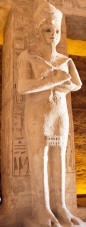 وسقف قاعة الأعمدة الكبرى محمول على ثمانية أعمدة أمام كل منها تمثال إرتفاعه 10 أمتار للفرعون رمسيس الثانى على شكل اوزريس اله الموت ------------------------->