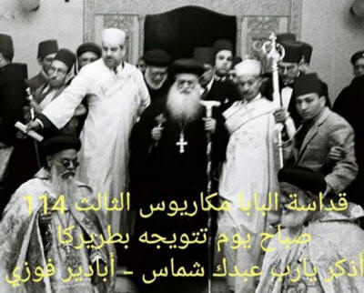 صورة اليوم لقداسة البابا مكاريوس الثالث 114 وهو خارج من القصر البطريركي متجها للكنيسة المرقسية صباح يوم تتويجه بابا وبطريركا للكرازة المرقسيةويظهر أمام قداسته على يمينه (على يسار الصورة) أنبا يوساب مطران جرجا القائم مقام البطريرك وكان مرشحا معه لمنصب البابوية ثم صار البابا يوساب الثاني 115 بعد نياحة أبينا القديس البابا مكاريوس الثالث 114 ويظهر أمام قداسته على يساره (على يمين الصورة) أنبا يوأنس مطران الجيزة والقليوبية أذكر يارب عبدك شماس - أبادير فوزي |