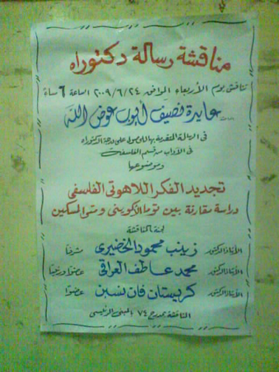 المقدمة في كلية الآداب قسم الفلسفة بجامعة القاهرة يوم الأربعاء 24 يونيو 2009، وموضوعها "تجديد الفكر اللاهوتي الفلسفي – دراسة مقارنة بين توما الإكويني ومتى المسكين" مع توصية بطباعة الرسالة. ناقش الباحثة الأستاذ الدكتور محمد عاطف العراقي -عضوًا ورئيسًا- والأستاذ الدكتور زينب محمود الخضيري –مشرفًا-، والأستاذ الدكتور كريستان فان نسبن –عضوًا-.