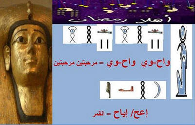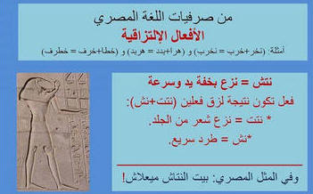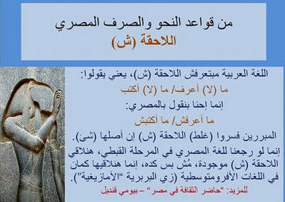 حرف ي يا : نقول يا ده يا ده. يا = أداة تخيير تعني أو ياسمين : من أسمي أي ياسمين زهور بيضاء صغيرة، جائز أن يكون الأصل عربي يالا: وتقال للأولاد وهي من ألا (ولد بالأخميمي) + أداة النداء العربي يا ياما : تعني كثير أو مجموعة من يا + آم يعني اكلت ماخلتشي قلب ولا ضلع يلا بره : من اليونانية إيلا بارا – وتعني إلى الخارج ينكت : يرقد هامسكك انكوتك هنا = هامسكك أرقدك هنا يو : حمار يوش : - أى يصدر صوتا رتيبا. ومنها كلمة يوشوش أى يتكلم قريباً من الأذن بصوت واطئ وحينما نمر بمنطقة زحام نقول كلمة "وش" بفتح الواو أى كلمات غير مفهومة تتعب الإنسان عند قهمها يوحا: ومعناها قمر ومنها وحوي يا وحوي أيوحا يرغى Roghi) وتعني حرفيا يغسل كثيرا بالماء والصابون, ويقولون في العامية المصرية الصابون لا يرغي جيدا. ************************************ والجميع بلا إستثناء أو فارق طبقى يتناول تلك الكلمة حين ينهى التلفاز عرضه اليومى أو حدوث خلل ما فى مستقبل الإرسال التلفزيونى.