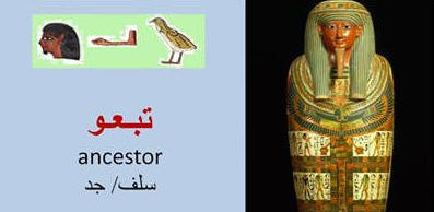 حرف ك كاسي : يا كاسي أي يا دفني أو يا ألمي اصطلاح مستخدم للتعبير عن الألم كاع : أعطي ،كع اللي في جيبه، وتحولت في القبطية إلى كا، والصيغة الكاملة لها كو كاكولا: رداء للكاهن كانى و مانى = عسل وسمنة كح = سعال كحك او كعك-وتعني كعك كخ = أنت شيطان كرار : من كراريون – كلاريون أي مخزن وقال في المثل سلموا القط مفتاح الكرار كش : (kish) وتعني حرفيا مكسور (broken) ومخلوع أو مرفوع من مكانه, وفي لعبة الشطرنج, يقول المنتصر للاعب الآخر كش ملك, أي أنه قد انهزم في هذا الدور (انكسر في المعركة). كارابيب : إ كلمة قبطية (Karapip) وهي اسم طائر 'الهدهد' صديق الفلاح المصري القديم,وقد تعني أيضا الإسراع بعمل شئ,ومنها قول العامة: 'أنت كربتي','والمكروب أو المكروبة علي الشغل' أي المندفع بسرعة في عمل شئ في غير وقته ، أى يعمل بالسخرة تحت ضرب الكرابيج أى السوط كرسي : من اليونانية كرسي وتعني مقعد وتستخدم في العامية وفي النصوص العربية غير الأدبية كرشه : من كروش أي ضيق، ويقال عنده كرشة نفس أي ضيق تنفس كرم : من اليونانية كرامي – وتعني زرعة كرمب (Krampi) : كرنب انتقلت لليونان والغرب باسم Grampo (جرامبو) من كرامبي (يونانية) ويسمي حاليا في مصركرنبو في الشام الملفوف,واعتاد الأقباط علي استخدام أوراقه في حشوها بالأرز من قديم الزمن ، وهو نبات (كوليفلاور) كرور : ضفدعة ، ويحتمل ان تكون منها بولاق الدكرور - وفي اللهجة المصرية المعاصرة 'بكرور' (bakrur) ودكرور,وكركر, أي ضحك بصوت مرتفع كالضفدع (frog) كلابة : كماشة أداة حديدية لنزع المسامير وخلافة كلكا = كلكع (تجمع وتلزج) : kelka وتعني بثرة (دمل علي الجلد) ومنها الكلمة المصرية الدارجة 'ة كلكوعة(كلكله) : ورم أو تضخم كلمة قبطية(Kelka) في الجسم,وكلكع الشي,أي لخبطة,وكلكعة أي بروز في الخشب كلوج : قلته – جرو كمان = أيضاً ولها أصل يوناني من كا + مان = و أيضاً كنبة : من اليونانية كانابي وتعني أريكة كوب : من اليونانية كوبا – ودخلت في العربية الكلاسيكية والعامية وتعني كأس صغير كوع , كوعى أو كويهي koihi : من كوي غير مؤكد إذا كانت الكلمة قبطي أم عربية وتعني بالقبطية ذراع أو أكمام للملابس,ومنها اشتقت كلمة 'كوع' بالذراع كولج: يقال فلان بيكلوج = بيعرج، من القبطية كولج معوج أو محني كومي : صمغ كومش Komsh : هزأ بشخص,استخف به,تهكم عليه,سخر منه (Sneer),أو استهان به كورم Korm : تعني دخان (smoke) أو سناج (هباب) وصنع منه الحبر الأسود كويك = أم قويق (طائر يشبه البومه) كيب : قبه ، وتستخدم في العربية الكلاسيكية بنفس المعنى وتنطق قبة كيك = كعك حرف ل لا La : تهمة, نميمة, ذم, إدانة شخص, إفتراء أو ظلم, حسد شخص علي نعمة لديه, دعوي قضائية ضد شخص خصم. لاك : اسم منطقة أو حصن ومنها بولاق الدكرور" حصن الضفدعة" ويقال انها من الفرنسية "بحيرة جميلة" لاكاك تعني كتير الكلام لالي - لعلع : وتستتخدم في الغناء والأفراح ويقال ياليلي ياعيني لبؤة : انثى الأسد من القبطية لابوي لبان : تستخدم في المراكب ويقال جر اللبان لوبش Lobsh : تفسيرا,أو شرحا,أو قمة شئ,أو نهاية. لبشة قصب : مجموعة عيدان ( تقال فى الريف ) معناها حزمة ودايما نقول لبشة قصب لبوة : أنثى الأسد من القبطية لابوي لبيس: نوع من الأسماك لبيس: نوع من الأسماك يدعى لبيس لج : لجاجة – لحاح لحلاح : أي طويل الكلام لحلاح : طويل لفت : نبات يوضع في الطرشي لقان : من اليونانية لاكانا لقمة : من اليونانية لاكامي ، وبالعربية لقيمة وغير معروف ايهما أخذ من الآخر لقمة : من اليونانية لاكلامي لكلك = اختلط لَكلَك: بمعنى سَلَطة , فمثلا عندما نقول : يا أخى ما بلاش لكلكة , يعنى ( ما تلخبطش الأمور ببعضيها). لوكلاك : أي قائل شر