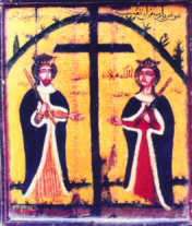 ققداسة البابا شنودة الثالث فى مجمع راهبات دير مار جرجس بمصر القديمة - الكرازة السنة 37 العددان3-4 6فبرابر2008 م ام قداسة البابا شنودة الثالث صباح الثلاثاء 27/1/2009م بزيارة ومباركة دبر مار جرجس بمصر القديمة للراهبات وقام قداسته بإفتتاح الكنيسة الأثرية بعد ترميمها وتجديدها وقد أعجب قداسته بما تم من إنجازة كذلك قام قداسته بسيامة أربع راهبات جدد بأسماء أنطونه وماريا زثيزدوره ومريم ، كما قام قداسته بإلباس خمسة من المبتدئات زى طالبات الرهبنة ، إشترك مع قداسته فى صلوات السيامة أصحاب النيافة الأنبا يوأنس وألأنبا رافائيل والأنبا أرميا - الكرازة السنة 37 العددان3-4 6فبرابر2008 م | أيقونة أثرية من القرن الثامن عشر الميلادي من دير الشهيد العظيم مارجرجس للراهبات بمصر القديمة,توضح صليبا في الوسط يعلوه زخرفة نباتية علي ما يشبه القبو وتقف الملكة هيلانة إلي يمين الصليب والملك قسطنطين إلي شماله,وكل منهما يشير بيده إلي الصليب بينما يمسك بيده الثانية قضيبا ومكتوب بجواره قضيب الملوك وفي الوسط عبارة السلام للصليب سلاح المؤمنين وعلي رأس كل منهما تاج وتحوطه الهالة النورانية.الباحث الأثري جرجس داود وطنى 15/3/2009م الينة 51 العدد 2464 |