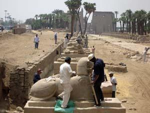 وأوضح منصور بريك المشرف العام على آثار الأقصر أنه تم العثور على العديد من قواعد تماثيل الكباش في القطاع الأخير من طريق الكباش أمام معابد الكرنك وتحتوى هذه الكتل على نقوش ومناظر وتؤكد أن الملك أمنحتب الثالث ( 1410-1372 ق.م) هو الذي شيد هذا الجزء من الطريق . إعادة طريق الكباش يشار إلي أن المجلس الأعلى للآثار يقوم حاليا بإعادة طريق الكباش الذي يربط بين معبدى الأقصر والكرنك ويبلغ طوله 2700 مترا وعرضه سبعين مترا لإحيائه مره أخرى بعد أن تم إزالة كافة التعديات على الطريق الأثري . ويتشكل الطريق من خمسة قطاعات الأول ويقع أمام معبد الأقصر وقد تم الانتهاء من الحفائر به وكشف عن 128 تمثالاً على هيئة أبو الهول وتم الانتهاء من ترميمها ويقع القطاع الثاني خلف كنيسة العذراء والذي تم الكشف به عن مقصورة للكاهن من خبر رع وهو من كهنة الأسرة الحادية والعشرين ( 1081-931 ق.م) وقد شيدها على الطريق. كما تم الإنتهاء من العمل في القطاع الثالث من الطريق والذي يقع خلف مكتبة مبارك العامة بالأقصر وتجرى حاليا التشطيبات النهائية لمداخل هذا القطاع وإقامة أماكن التفتيش والحراسة . |