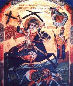 | | وطنى 6/6/2010م د.أمال جورجي تعيد كنيستنا القبطية الأربعاء المقبل بتذكار ظهور جسد يوحنا المعمدان وإذ أنشر أيقونة العماد في هذا المناسبة أوضح الكرامة التي نالها هذا القديس. شهداء كثيرون نالوا كرامات ولكن يوحنا المعمدان فاق عليهم جميعا فليس بين كل الشهداء من استحق أن يضع يده علي رأس يسوع المسيح الطاهرة. إنه يوحنا الذي أعلنلست مستحقا أن أحل سيور حذائهلو3:16 أنا أعمدكم بماء وهو يعمدكم بالروح القدس ونارينبغي أن ذاك يزيد وأنا أنقص. لهذا استحق أن يضع يده علي رأس المسيح وأن يري السماء مفتوحة والروح نازلا مثل حمامةيو1:32. الإيقونة بالمتحف القبطي داخل عقد نصف دائري وتؤرخ بالقرن 18. | وطنى 14/6/2010م د. آمال جورجي هكذا كتب باللفافة بيد الملاك حينما أعطاه سيفا به يغلب الأعداء, بالإضافة إلي سيف الجندية إذ كان ضابطا بالجيش, ولهذا يطلق عليه أبي السيفين, إنه القديس العظيم فيلوباتير مرقوريوس الذي نعيد بتذكار نقل أعضائه إلي مصر الأربعاء المقبل, أما عن كلمة فيلوباتير فهي لفظ يوناني يعني محب الإله. أيقونة زاخرة بالأحداث, بأعلاها الملاك وبأسفلها الإمبراطور الروماني الجاحد يوليانوس ساقطا علي وجهه إلي الأرض, كما تظهر كتابة بحروف قبطية ترجمتها القديس محب آباءه مرقوريوس, ولا تغفل عن ظهور القديس باسيليوس الكبير أسقف قيصرية, ما مغزي ذلك؟؟ سوف أجيبك عزيزي القارئ في تذكار هذا القديس بمشيئة الرب. الأيقونة داخل عقد به زخارف نباتية بكنيسة أبي سيفين بمصر القديمة, تؤرخ بعام 1488س.