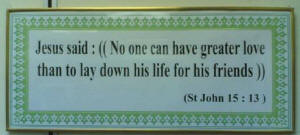 وضعت لوحة كبيرة مكتوب عليها نص من الكتاب المقدس هو (ما من حب أعظم من هذا، ان يضحي الإنسان بنفسه في سبيل أحبائه) يوحنا 15-13، في صدر احدى القاعات الرئيسية لمجلس الوزراء العراقي بالعاصمة العراقية بغداد، وهو ما يحدث