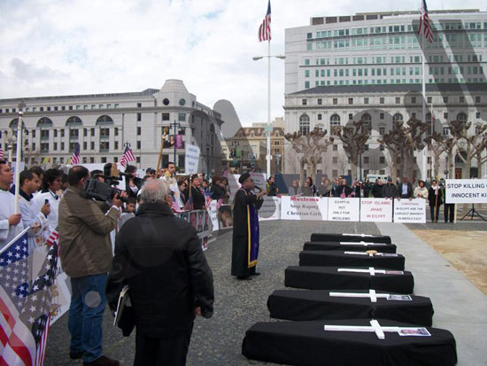 وقاموا بأداء صلاة القداس على أرواح الضحايا، ورددوا استغاثات بالرئيس الأمريكى أوباما والأمم المتحدة، للتدخل لإنقاذ المسيحيين من "الاضطهاد" ومطالبة الرئيس مبارك بتحمل المسئولية فى وقف ما أسموه "مذبحة" الأقباط فى مصر، وتضاربت مشاعر المشاركين ما بين غضب وتصعيد جارف وبين نداءات للتعايش فى سلام دون تعصب أو تمييز فى حين امتنعت بعض الكنائس عن المشاركة فى تلك الوقفة. رصد اليوم السابع تلك الحالة من الغليان التى وصلت بالبعض لمنع احد المشاركين من رفع علم مصر واستبدلوه بالعلم الأمريكى فى رسالة قالوا إنها موجهة إلى الحكومة المصرية والرئيس مبارك بضرورة التحرك وتغيير ما وصفوه بالتمييز ضد المسيحيين فى بناء الكنائس والوظائف وغيرها من الأمور، |