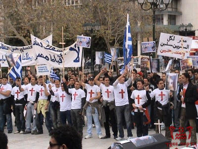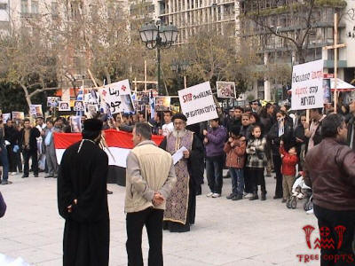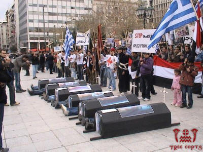 كهنة وشعب كنيسة السيدة العذراء والقديس مارمرقص باثينا يدعون كل الشعب القبطى بااليونان وذلك فى يوم الخميس 21/1/2010 لعمل وقفة احتجاجية امام البرلمان اليونا نى والسفارة المصرية لعرض ذبح الاقباط فى مدينة نجع حمادى والقبض على الابرياء وايداعهم السجون من خلال امن الدولة المصرية وارهاب الناس والمطالبة بمحاكمة دولية للحكومة المصرية