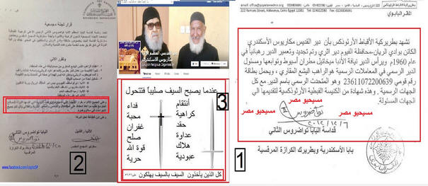 مسيحيو مصر .. تكشف بالمستندات أول واقعة فى تاريخ الكنيسة القبطية بل فى كنائس العالم أجمع , بالغاء دير أصدر البابا البطريرك شهادة رسمية بانه ( دير .. اثرى .. تم .. تعميروتجديد الدير رهبانيا من عام 1960 ) وله رئيس وله مسئول ) باعتراف البابا ذاته ووضع 120 راهب و150 طالب رهبنة فى عرض الطريق . فلنبدأ القصة بالسمتند المكتوب عليه رقم (1) فى الصورة اعلى الخبر , حيث اصدر البابا تواضروس الثانى عقب تجليسه على كرسى مارمرفس ليكون البابا ال 118 فى تاريخ الكنيسة , بعد التجليس بايام وبالتحديد فى 6 ديمسبر 2012 باصدار شهادة رسمية منه وبأسم الكنيسة القبطية الارثوذكسية تنص على . (تشهد بطريركية الاقباط الارثوذكس , بان دير القديس مكاريوس الاسكندرى , الكائن بوادى الريان , محافظة الفيوم .. دير اثرى ..وتم تجديد وتعمير الدير ..رهبانيا .. عام 1960 م ويراس الدير نيافة الانبا ميخائيل مطران , اسيوط وتوابعها ومسئول الدير الرسمى فى المعاملات الرسمية هو الراهب اليشع المقارى ويحمل بطاقة (.......) وهو المتحدث الرسمى بأسم الدير مع كل الجهات الرسمية , وهذه شهادة من الكنيسة القبطية الارثوذكسية لتقديمها للجهات المسئولة تواضروس الثانى بابا وبطررك الكرازة المرقسية فى 6/12/2012وختم مقر البابا. اى ان الدير كائن وفق اعتراف البابا وبشهادته وشهادة الكنيسة منذ 1960. بينما أعن مجلس الوزراء المصرى منطقة الريان بالفيوم محمية طبيعية عام 1989 بقرار من مجلس الوزراء , أى بعد أقامة الدير ب 29 عاما بالتمام والكمال , ومعروف ومعلوم لدى الدولة وأجهزة المحافظة الدير عامر برهبانه. فجأة دب خلاف منذ سنوات 5 سنوات بين محافظة الفيوم والدير , حول وضعه , ورغبته فى تنفيذ طريق الفيوم - الواحات لاقامة تنمية , ووضع مخططوا الطريق مخطط الطريق على أعتبار ان الدير غير موجود ولن نقول تعمد ان يقطعه شطرين ؟؟؟؟, وظل فى ايام البابا شنودة الثالث الوضع معلق , ولم يستطع أحد تنفيذ الطريق , بل طلب البابا الراحل دراسة حلول وسط ترضى الدولة وتنفذ خططها دون ان نهدر دير اثرى للكنيسة القبطية ووجوده دعم للسياحة لمنطقة وادى الريان . وجاء البابا تواضروس وجلس بطريرك فى 18 نوفمبر 2012 , ولانه من أحباء ومن مريدى الفكر المقارى , وأغلب رهبان الدير أساسا من ابو مقار , فأصدر شهادة بابوية للتاريخ تحدد هوية الدير الاثرية والرهبانية ويعترف به دير له رئيس ومسئول وحياة رهبانية ؟؟ وفى الاونة الاخيرة , قام وزير البيئة ومحافظ الفيوم منذ اسبوعان تحديدا بزيارة تفتيشية للدير , وقال بعدها وزير البيئة فى مؤتمر صحفى بحضور المحافظ فى الفيوم , الطريق سيقام سيقام وسيشق الدير سيشقه , فى الوقت الذى تقدم فيه رهبان الدير بحلول وسيطة تضمن مرور الطريق وتحقيق خطط الدولة للتنمية والرخاء , الكلام الكبير ده , فرفضت , والاربعاء الماضى اراد الراهب اليشع المقارى المسئول المعين من قبل البابا تواضروس لقاؤه للاستنجاد به لدراسة عروض الدير البديلة مع وزيرى البيئة والنقل ومحافظ الفيوم , ففوجئ بمقابلة صادمة من البابا , كان ذلك الاربعاء الماضى ’ , وقال له أجلسوا مع القس انجيلوس اسحاق بكرة , , ويم الخميس, جلس الرهبان مع القس انجيلوس اسحاق واستدعى لهم البابا لحضور الجلسة فجأة رجله القوى الانبا ارميا الاسقف ورئيس المركز الثقافى القبطى والانبا ثيؤديوسيس اسقف الجيزة , ودار نقاش الرهبان فى وجودهم مع القس انجيلوس أسحاق كأنه مطران وسط اساقفة ورهبان ؟؟ وامر الرهبان بكل حزم بالموافقة الكاملة وغير المشروطة على على أقامة الطريق وشق الدير , وأعترض الرهبان على اهدار دير بهذه القيمة الاثرية وبهذا العمران الرهبانى وبالطبع أنفعلوا على دير ذو تاريخ ورهبنة عامرة واعداد هائلة من الرهبان والحركة الرهبانية التى باتت تجذب الزيارات من كل العالم . وأشبتك الطرفان بالالفاظ لدرجة ان الانبا ارميا أنسحب معترضا , الانبا ثيؤديوسيس حاول التهدئة بين الطرفين , وانتهى الاجتماع الى ثأر بين القس أنجيلوس اسحاق والدير ورهبانه , وظهرت بركات حوت المقر البابوى وزعيم سكرتارية ا