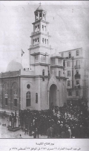 يوم تاريخى فى افتتاح كنيسة السيدة العذراء فى حى محرم بيك فى الاسكندرية أفتتاح الكنيسة فى عيد السيدة العذراء 16 مسرى 1651 ش الموافق 22 أغسطس 1935 م أستكملت كافة الأعمال و تحدد يوم 16 مسرى 1652ش الموافق 22 أغسطس 1935م و الذى يوافق عيد صعود جسد السيدة العذراء ليكون يوما لتدشين الكنيسة، و بدء الصلاه فيها فحضر غبطة البابا البطريرك يصحبة الآباء المطارنة الأجلاء يتقدمهم المتنيح الأنبا توماس مطران الغربية و من المرتلين المرحوم المعلم ميخائيل الكبير (مرتل الكاتدرائية المرقسية بالقاهرة) و المرحوم المعلم نجيب و المعلم لطفى(مرتلا الكنيسة المرقسية بالأسكندرية) و معهم لفيف من شمامسة الكنيسة المرقسية بالأسكندرية يتقدمهم الأستاذ رفلة عبد الملك و الأستاذ حنا أسعد و الأستاذ حنا ملك، و أبتدأوا بالصلاة لتدشين الكنيسة عشية السبت و باكر الأحد. | زيارة البابا كيرلس السادس الأولى لكنيسة السيدة العذراء فى محرم بك با لاسكندرية وكان يوما مشهود لطائفة الاقباط الارثوذكس وكان فى استقبالة كبار الاساقفة والقساوسة والشمامسة وعامة الشعب لنيل البركة منة وكان الزيارة عام 1940 | | | | |