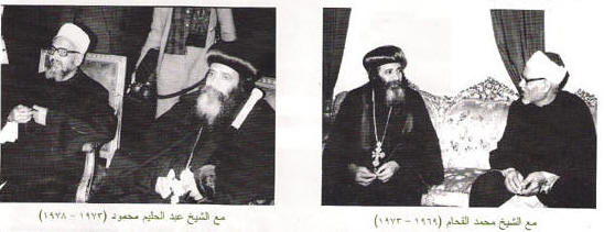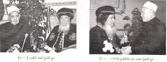 لقاءات قداسة البابا شنودة الثالث مع أصحاب الفضيلة شيوخ الجامع الأزهر من سنة 1971 - إلى ألآن سنة 2010محرص قداسة البابا أن تكون له علاقة طيبة مع كل أصحاب الفضيلة شيوخ الجامع الأزهر وكانت أول زيارة له فى أيام الشيخ عبد الحق على جاد الحق ليدعوه إلى حفل إفطار بمناسبة شهر رمضان ثم كثرت الزيارات فى أيام الأعياد وفى مناسبات أخرى أيام الشيخ محمد سيد طنطاوى الذى كان أكثر شيوخ الجامع الأزهر صلة بالبابا تجمعهما صداقة وطيدة كذلك كانت هناك لقاءات مع أصحاب الفضيلة شيوخ الجامع الأزهر أثناء الحضور لجلسات إستماع فى مجلس الشعب وأيضاً خلال دعوتهم إلى البطريركية لحضور حفل إفطار رمضان وذلك إبتداء من سنة 1986 على التوالى الكرازة السنة 38العددان15-16 28 مايو2010