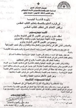 رسالة من إيبارشية ملوى ونيافة الأنبا ديمتريوس بتأييد قداسة البابا شنودة الثالث ضد حكم المحكمة الإدارية بإلزامه |