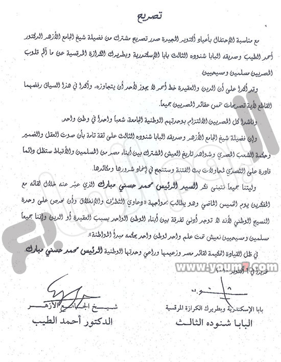 موسوعة تاريخ أقباط مصر - coptic history بقلم عزت اندراوس بيان شيخ الأزهر والبابا شنودة لـ"وأد" الفتنة |