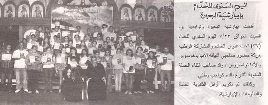 الانبا باخوميوس مطران البحيرة ومطروح والخمس مدن الغربية يقوم بسيامة كاهن جديد لكنيسة الشهيد العظيم مارجرجس بدمنهور موقع سى تى فى 5/7/2011م CTV قام نيافة الحبر الجليل الانبا باخوميوس مطران البحيرة ومطروح والخمس مدن الغربية ونيافة الحبر الجليل الانبا تواضروس اسقف عام البحيرة بسيامة كاهنا جديدا على كنيسة الشهيد العظيم مارجرجس بدمنهور يوم الجمعة الماضية الموافق الرابع والعشرين من شهر يونيو الماضى حضر السيامة عدد كبير من الاباء الكهنة وشعب الايبارشية واسرة الكاهن. |