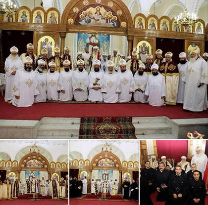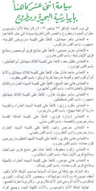 السبت ٢١فبراير ٢٠١٥ م سيامة كهنة بالبحيرة قام صاحب النيافة الحبر الجليل اﻷنبا باخوميوس مطران البحيرة ومطروح والخمس المدن الغربية ورئيس دير القديس اﻷنبا مكاريوس السكندري اليوم بسيامة ثمانية آباء كهنة جدد للخدمة في كنائس ومذابح اﻷيبارشية وهم : 1_ الشماس ماجد يونان بأسم القس أكسيوس كاهنا على مذبح كنيسة رئيس الملائكة ميخائيل ومذابح قري كفر الدوار . 2_ الشماس عماد غالي بأسم القس فلتاؤوس كاهنا علي مذبح كنيسة مارمينا كنجي مريوط لخدمة منطقة أبو الريش . 3_ الشماس ماجد بهيج بأسم القس أثناسيوس كاهنا علي مذبح كنيسة مارمينا كنجي مريوط لخدمة منطقة الكابلات والطريق الجديد . 4_ الشماس نادر صبحي بأسم القس سلوانس كاهنا علي كنيسة الشهيد ابي سيفين جنوب التحرير . 5_ الشماس فهمي فوزي بأسم القس بيشوي كاهنا علي مذبح اﻷنبا بيشوي بالوكيل ومذابح قري كفر الدوار . 6_الشماس أبراهيم عهدي بأسم القس مويسيس كاهنا علي كنيسة السيدة العذراء مريم بالضهرية . 7_ الشماس مينا جرجس بأسم القس مارتيروس كاهنا علي كنيسة السيدة العذراء مريم بالسادات . 8_ الشماس ألفي سعد بأسم القس ناثان كاهنا علي كنيسة السيدة العذراء والشهيدة كاترين بالناصرية . وقد شارك في قداس السيامة المباركة صاحبي النيافة اﻷنبا أندراوس اسقف أبوتيج وتوابعها . واﻷنبا ايساك اﻷسقف العام والمدبر الروحي لدير اﻷنبا مكاريوس السكندري بالبحيرة ويقضي اﻵباء الكهنة الجدد فترة اﻷربعين المقدسة بدير اﻷنبا بيشوي العامر بوادي النطرون . |
