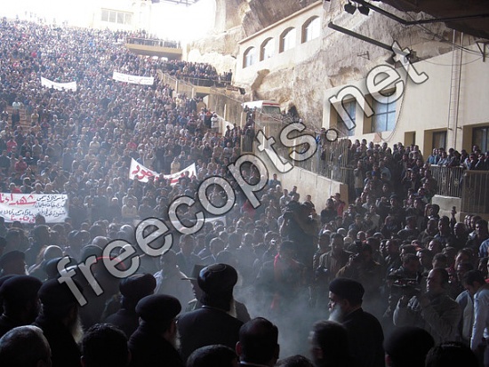 حضر آلاف المسيحيين بمصر يوم الخميس 10/3/2011م قداس الجنازة لضحايا أسوأ اشتباكات طائفية تشهدها البلاد منذ تخلي الرئيس حسني مبارك عن منصبه |