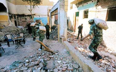 الأخشاب المعدة للسقالات ونقل الأسمنت والطوب أمس أثناء بدء بشكل فعلى أولى خطوات إعادة البناء فى نفس المكان ونفس الهيئة.استعان أمس بحوالى 80 مجندا واليوم زادوا إلى 150 مجندا، بالإضافة إلى زيادة عدد القلابات من اثنين إلى 8 قلابات نظرا لصعوبة الدخول والخروج من وإلى شارع الكنيسة والذى لم يتجاوز عرضه ثلاثة أمتار وكان يشكل خروج القلابات بالتناوب استهلاكا للوقت سواء فى الخروج من موقع الكنيسة وحتى خارج البلدة لإلقاء الهدم والمخلفات.